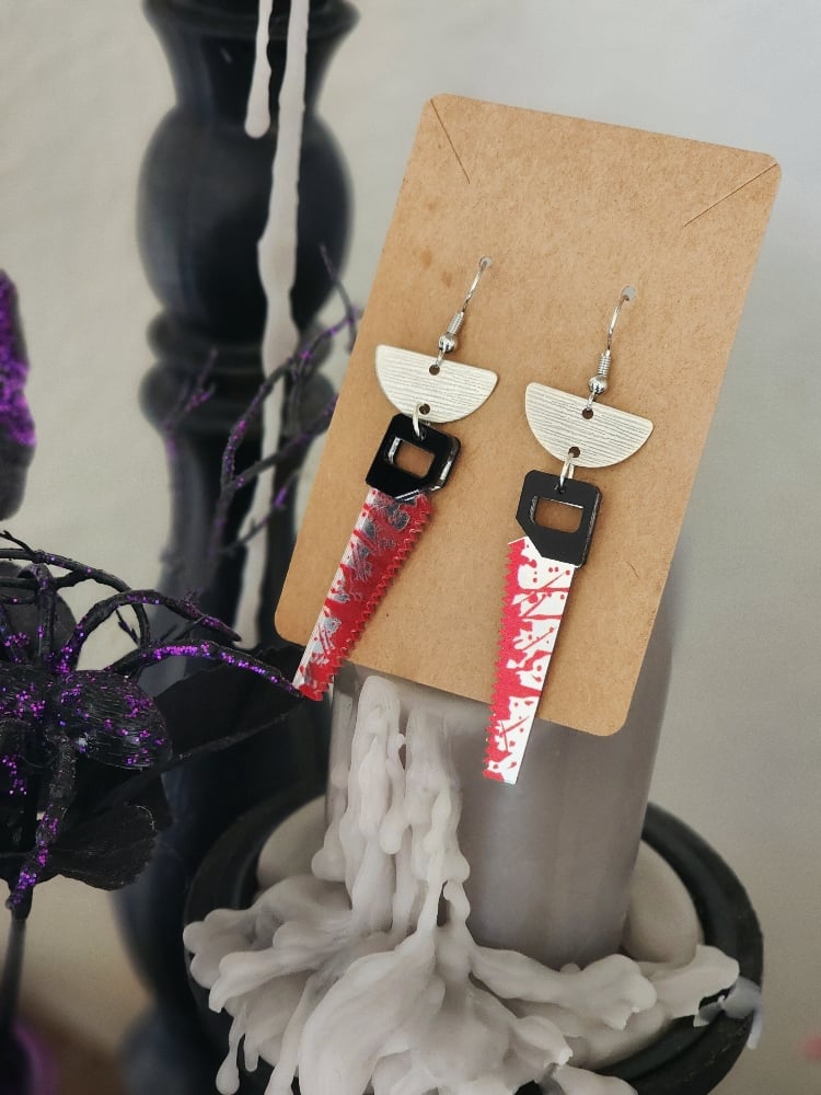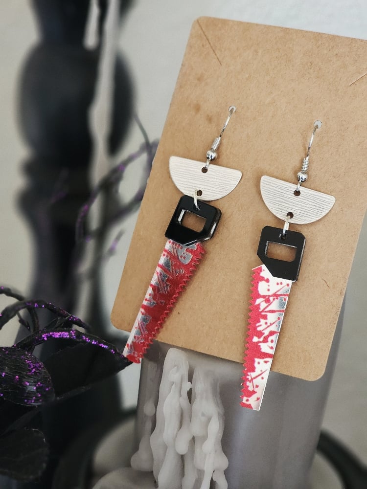 Handmade earrings with bloody saw charms